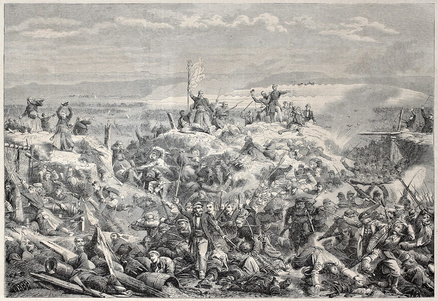 Old illustration of the taking of Malakoff by French army during Crimean war. Created by Yvon, published on L'Illustration Journal Universel, Paris, 1857